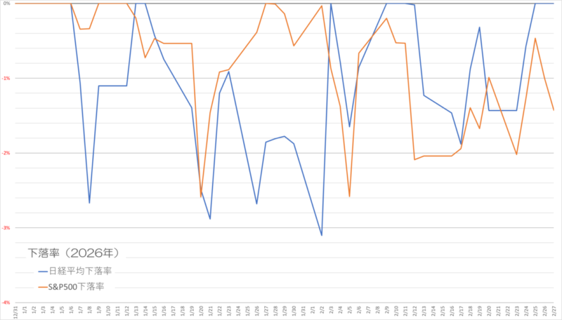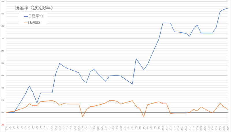 2026年の年初来の動きを見ると、日経平均とS&P500ではかなり異なる動きが見えてきます。