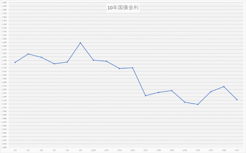 2026年2月の日本国債10年利回りは、これまで続いていた上昇基調がいったん落ち着き、やや下落する動きとなりました。月初は2.23〜2.25%付近で推移していましたが、中旬にかけてじわじわと低下。2月17日には2.14%まで下がりました。