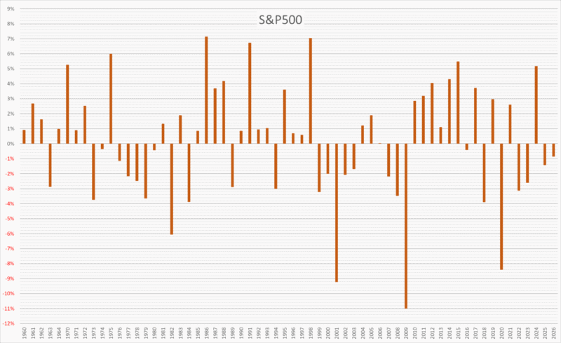 年によっては+7%台まで上昇することもあれば、−10%を超える下落になる年もあり、振れ幅自体はそれなりにあります。ただ、2026年の2月はその中でも比較的落ち着いた動きの1カ月だったと言えそうですね。📊