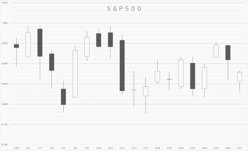 2月のS&P500は、まさに「レンジ相場」という言葉がぴったりの1カ月でした。同じような価格帯を行ったり来たりする動きが続き、はっきりと上か下に抜けるような展開は見られませんでした。高値と安値の差も比較的コンパクトで、全体としては方向感の乏しい相場に。最終的には前月比−0.87%と、小幅ながらマイナスで終了しました。