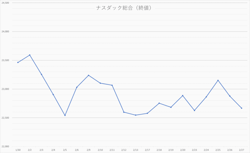 2月のナスダック総合は、月初から下落してやや勢いを失うスタートとなりました。その後は同じような価格帯の中で上下を繰り返す、レンジ気味の展開が続きます。大きく崩れるわけではないものの、上値も重く、方向感に欠ける動きが続いた印象です。結果として、前月比では約3%のマイナスとなりました。