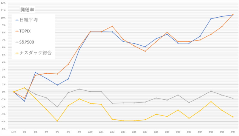 結果として、2月は「日本株は力強く上昇、米国株はやや伸び悩み」という構図がはっきりと表れた1カ月だったと言えそうです。