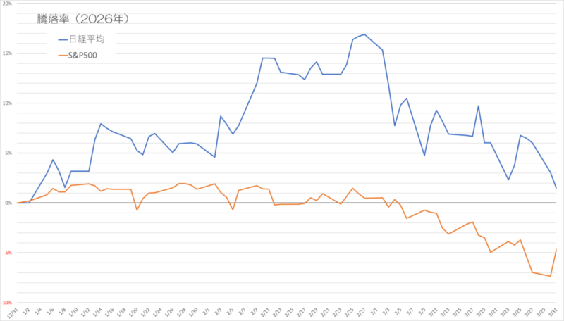 2026年の日経平均とS&P500の年初来推移を比べると、この3カ月は両者の値動きの違いがかなりはっきり表れています。