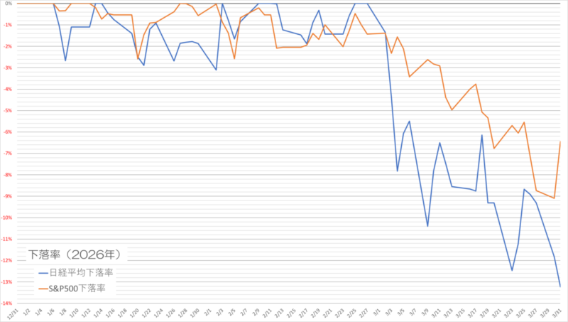 日経平均は1月から勢いよく上昇し、2月には +16%台 まで伸びるなど強い上昇基調が続きました。一方のS&P500はプラス圏を維持しながらも、上昇幅は 1〜2%台 にとどまり、比較的落ち着いた動きでした。しかし3月に入ると流れが変わり、日経平均は高値から -13%超 の急落。S&P500も -6%前後 まで下げる場面がありました。