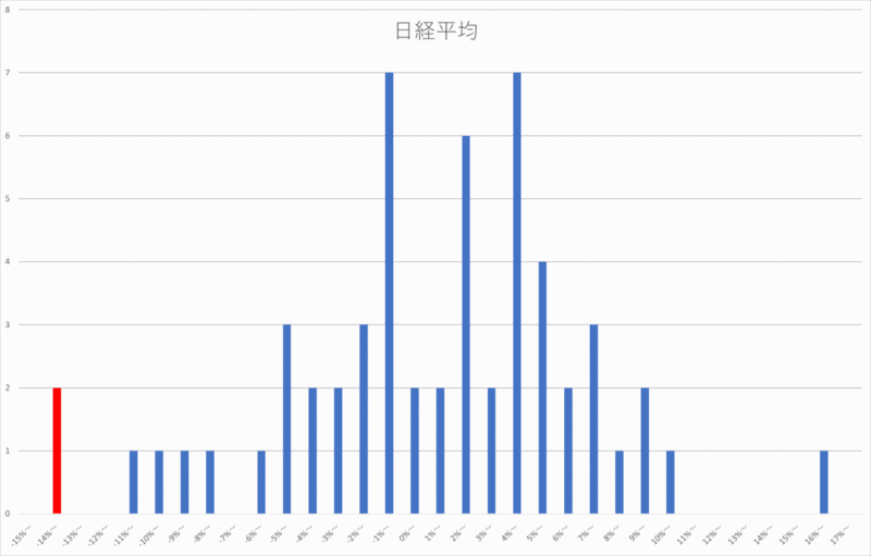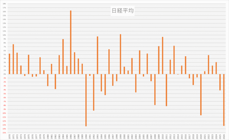 平均騰落率は +1.15% ですが、標準偏差は 5.83% とやや大きく、年によって値動きに差が出やすい傾向もうかがえます。2026年3月は、その中でも下げ幅が目立つ年のひとつになりました。
