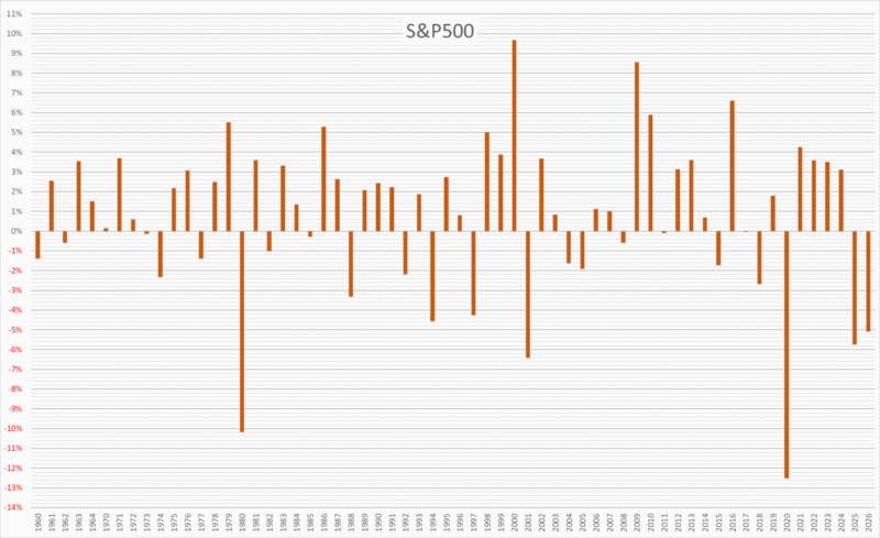 一方で、過去には 1980年の -10.18% や、2020年の -12.51% のように、大きく下げた年もあります。2026年3月も、それらほどではないものの、やや大きめの下落となった月でした。