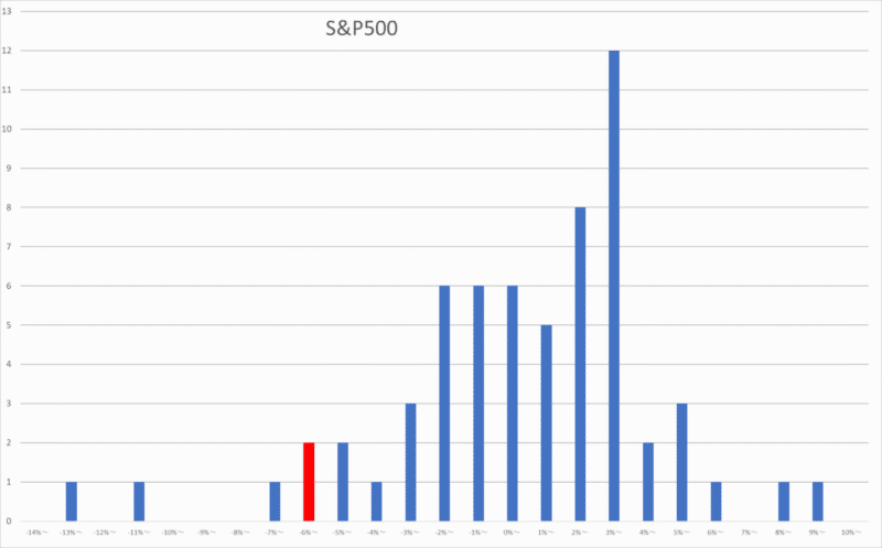 S&P500の3月は、過去データでは プラスが39回、マイナスが23回 と、こちらも上昇した年のほうがやや多くなっています。2〜3%台の上昇 が見られる年が比較的多く、落ち着いた動きになりやすい月ともいえます。