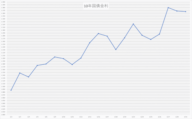 2026年3月の日本国債10年利回りは、月初の 2.08% から月末には 2.36% へと上昇し、月を通して見るとじわじわと金利が上がる動きとなりました。大きく跳ねるというよりは、少しずつ水準を切り上げていくような流れだった印象です。