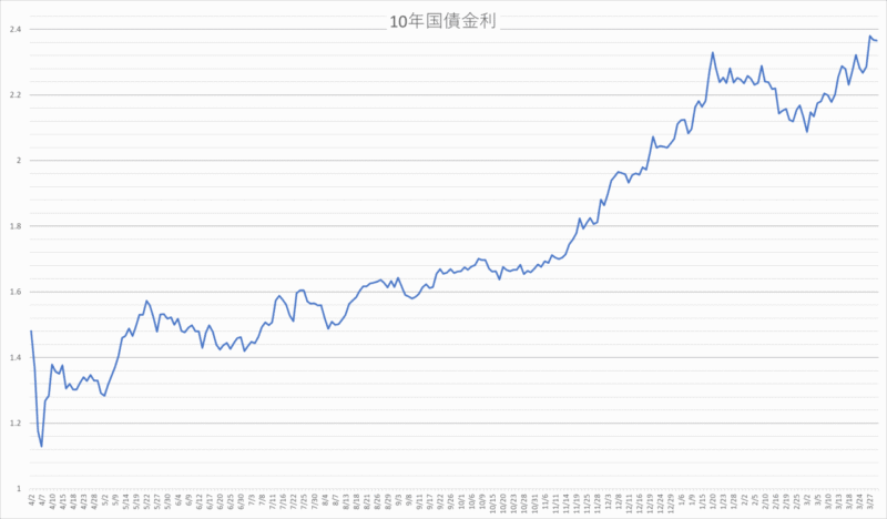過去1年間で見ると、日本国債10年利回りは全体としてゆるやかに上昇する場面が増えてきました。