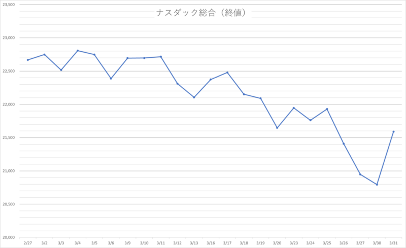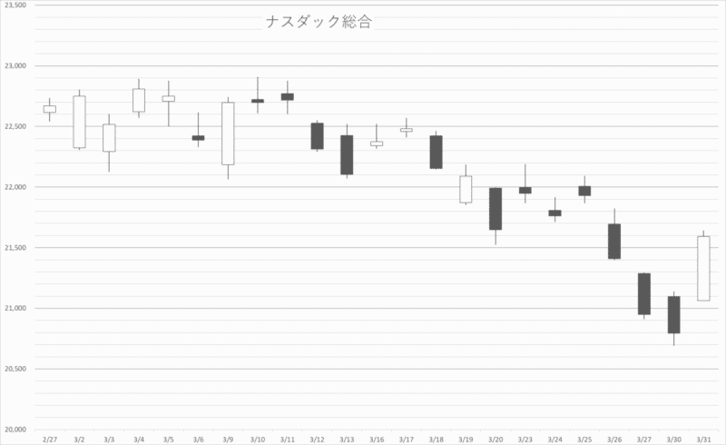 2026年3月のナスダック総合も、他の主要指数と同じく下落基調となり、特に中旬以降は売りが重たく感じられる展開でした。