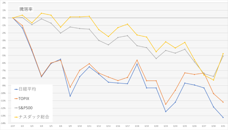 4指数の騰落率を並べて見ると、そろって下向きのカーブを描いており、3月は世界的にリスク回避ムードが強かったといえそうです。
