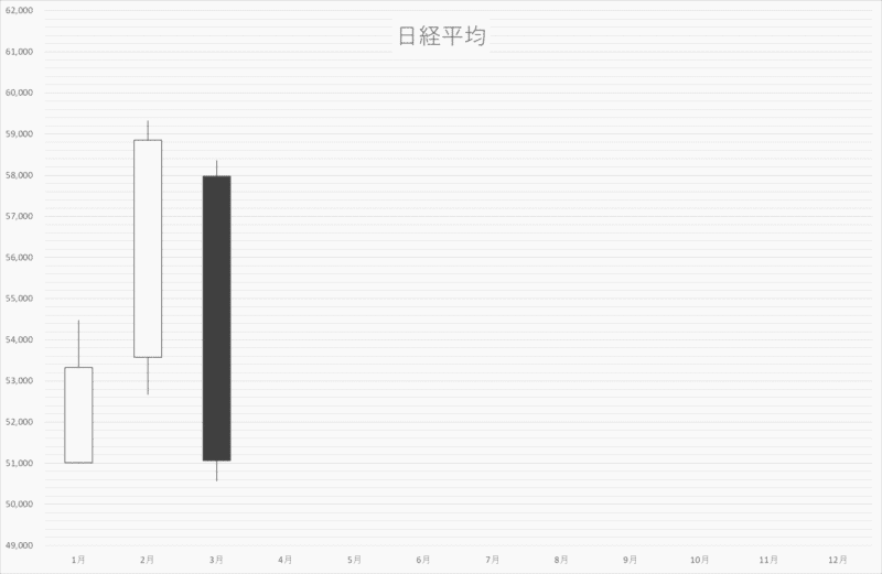 1月は +5.93%、2月は +10.37% と力強く上昇し、2月には年初来高値となる 59,332円 を記録。年明けから強い買いが続き、市場には前向きなムードが広がっていました。ただ、3月に入ると流れが一変し、月間では -13.23% と大きく下落。月末には年安値に近い 50,558円 まで下げる場面もあり、ここまでの上昇分を一気に打ち消すような動きとなりました。